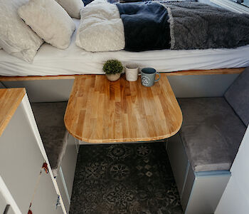 Das Bett ist ein Querbett und hat eine Breite von 1,40m und eine Länge von 1,93m. Die Bettwäsche bekommst Du von uns gestellt. Bei dem Bett handelt es sich um ein festverbautes Bett. Das heißt, Du musst das Bett nicht täglich umbauen, sondern kannst Dich nach dem Aufstehen direkt an den Frühstückstisch setzen. Und wer weiß, vielleicht hast Du ja einen fleißigen Helfer dabei, der den Tisch deckt?! ;)