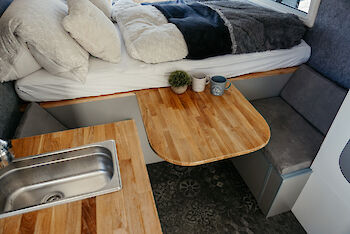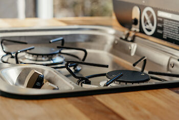 Die Küchenzeile besteht aus einer Arbeitsfläche mit Spüle und festem Gaskocher. Die Arbeitsfläche lässt sich ganz einfach erweitern. Die Kühltruhe befindet sich direkt unter der Küchenzeile. Und weil Du im Sommer bestimmt die Zeit lieber draußen verbringen möchtest, gibt es noch einen mobilen Gaskocher mit dem Du sogar im Freien kochen kannst. Besteck und Geschirr sind inklusive.