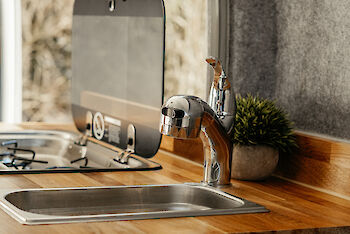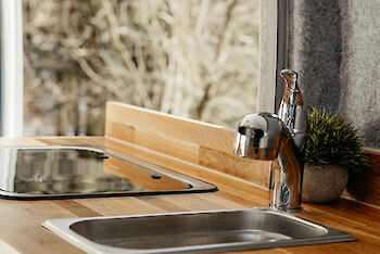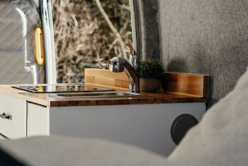- Küchenzeile mit Spüle und Campingkocher