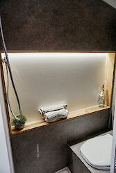 Auch ein Bad ist im Van verbaut. Mit einer Trockentrenntoilette und einer Dusche. Bei 130l Wasser an Bord kannst Du einige Male duschen. Und keine Sorge: Das Wasser wird durch einen verbauten Warmwasserboiler erwärmt. Durch einen Außenanschluss wird das Wasser von außen direkt in den Wasserkanister gefüllt. Den Wasserkanister kannst Du auf jedem Campingplatz, einigen Stellplätzen oder auch an Tankstellen auffüllen.