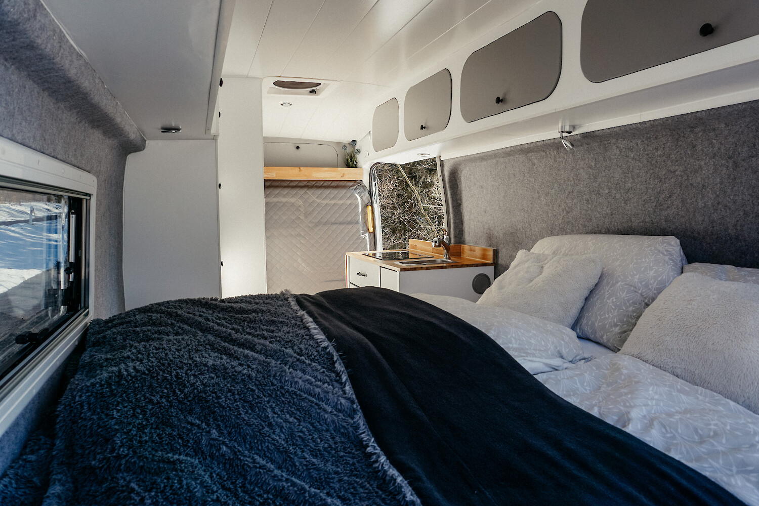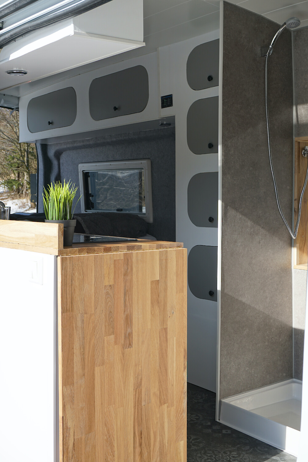 Im Winterurlaub heizt die Standheizung den Van auf und es ist schön kuschelig warm im Van. Auch die Dusche musst Du nicht mit kaltem Wasser über Dich ergehen lassen, die Heizung erhitzt auch das Wasser und Du kannst angenehm warm duschen.