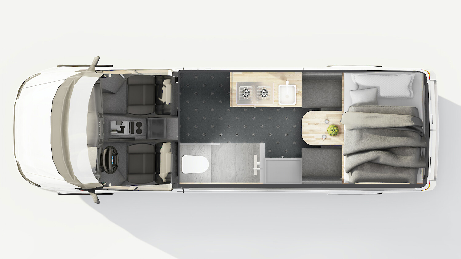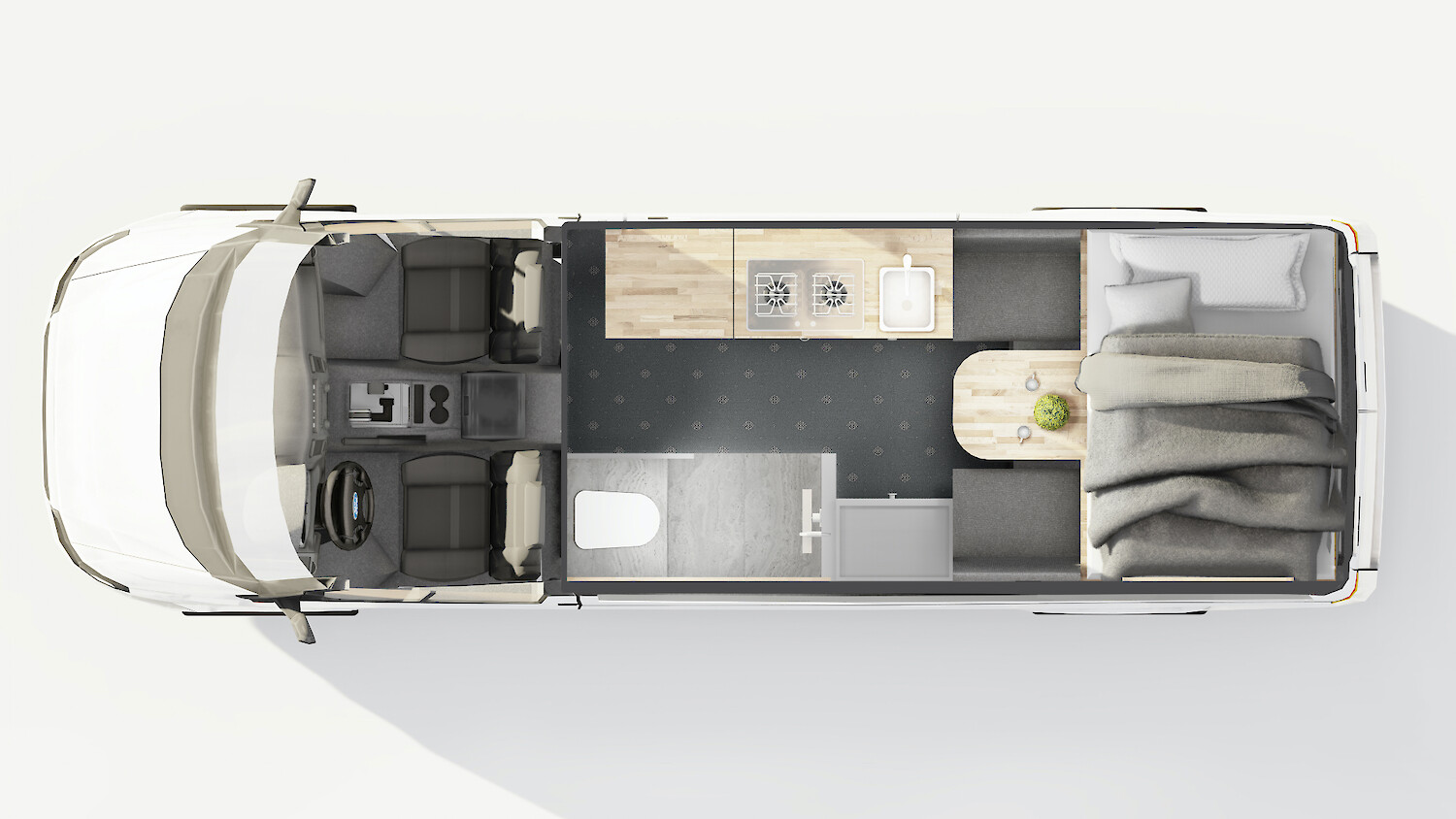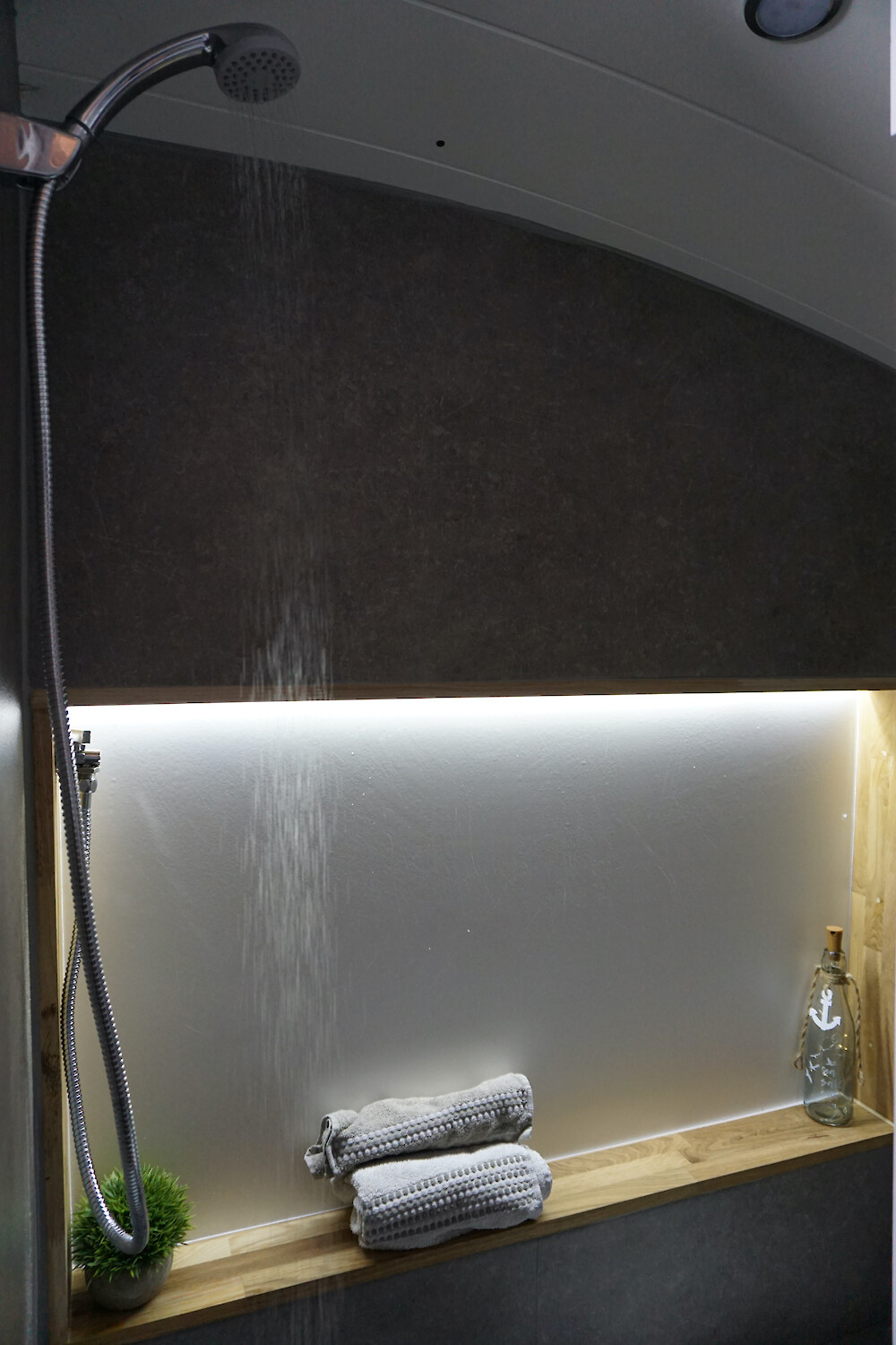 Auch ein Bad ist im Van verbaut. Mit einer Trockentrenntoilette und einer Dusche. Bei 130l Wasser an Bord kannst Du einige Male duschen. Und keine Sorge: Das Wasser wird durch einen verbauten Warmwasserboiler erwärmt. Durch einen Außenanschluss wird das Wasser von außen direkt in den Wasserkanister gefüllt. Den Wasserkanister kannst Du auf jedem Campingplatz, einigen Stellplätzen oder auch an Tankstellen auffüllen.