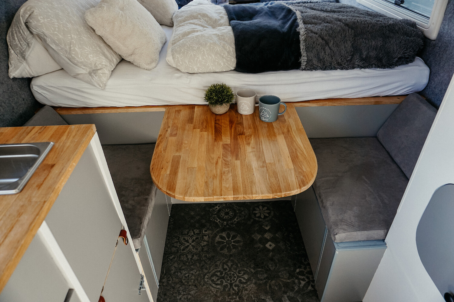 Die Küchenzeile besteht aus einer Arbeitsfläche mit Spüle und festem Gaskocher. Die Arbeitsfläche lässt sich ganz einfach erweitern. Die Kühltruhe befindet sich direkt unter der Küchenzeile. Und weil Du im Sommer bestimmt die Zeit lieber draußen verbringen möchtest, gibt es noch einen mobilen Gaskocher mit dem Du sogar im Freien kochen kannst. Besteck und Geschirr sind inklusive.