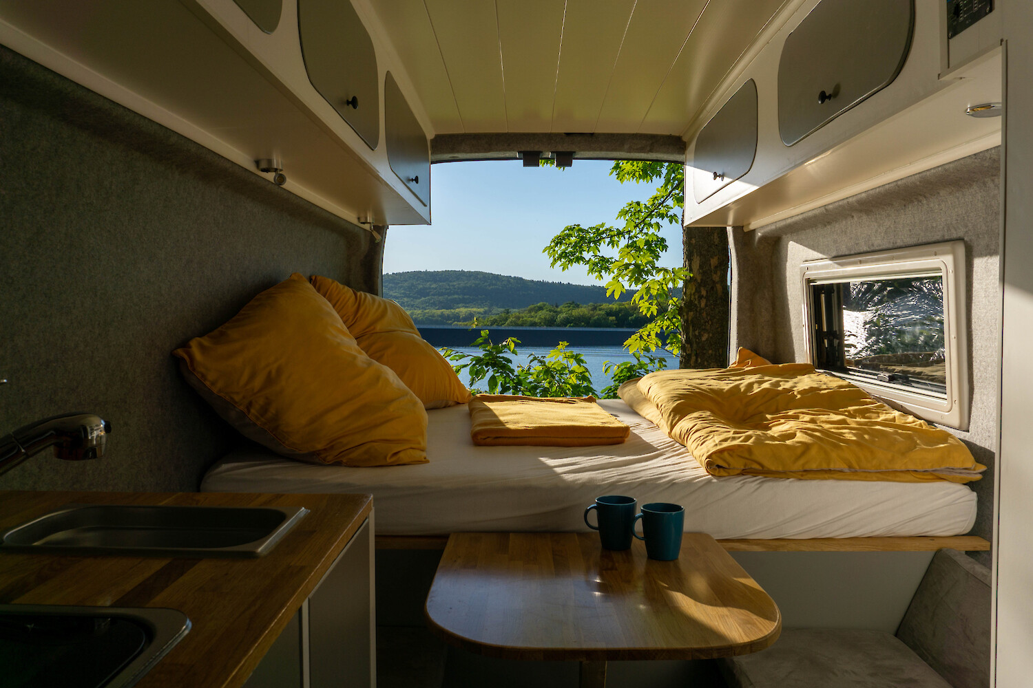 Für den Sommerurlaub sind zwei Campingstühle sowie ein Campingtisch inklusive. Damit Du keinen Sonnenbrand bekommst, kannst Du unter der großen Markise sitzen. Und keine Sorge - trotz hoher Temperaturen im Sommer, kühlt es im Van Dank eingebauter Dachhaube für Be- und Entlüftung ab. Und am Abend, wenn die Temperaturen sinken, kannst Du durch Öffnen der Schiebetür sowie der Hecktüren einen kompletten Luftaustausch vornehmen. Ein mit warmer, stickiger Luft aufgeheizter Van ist daher nicht Teil Deines perfekten Urlaubs. Und noch was: Die Campingfenster sind so verbaut, dass Du diese sogar nachts offen lassen kannst und die Luft optimal zirkulieren kann (die Campingfenster sind auf beiden Seiten, einmal weiter hinten, einmal weiter vorne verbaut - optimal für den Luftaustausch).