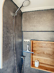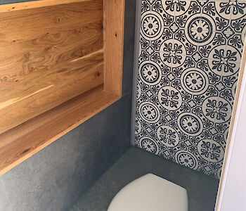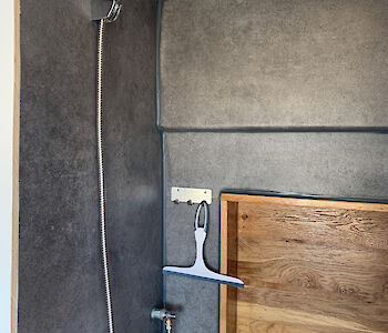 Auch ein Bad ist im Van verbaut. Mit einer Trockentrenntoilette und einer Dusche. Bei 130l Wasser an Bord kannst Du einige Male duschen. Und keine Sorge: Das Wasser wird durch einen verbauten Warmwasserboiler erwärmt. Durch einen Außenanschluss wird das Wasser von außen direkt in den Wasserkanister gefüllt. Den Wasserkanister kannst Du auf jedem Campingplatz, einigen Stellplätzen oder auch an Tankstellen auffüllen.