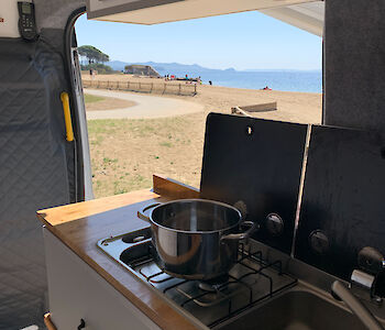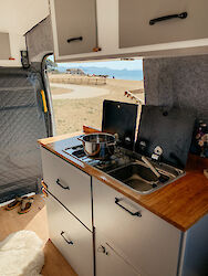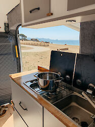 Die Küchenzeile besteht aus einer Arbeitsfläche mit Spüle und festem Gaskocher. Die Arbeitsfläche lässt sich ganz einfach erweitern. Die Kühltruhe befindet sich direkt unter der Küchenzeile. Und weil Du im Sommer bestimmt die Zeit lieber draußen verbringen möchtest, gibt es noch einen mobilen Gaskocher mit dem Du sogar im Freien kochen kannst. Besteck und Geschirr sind inklusive.